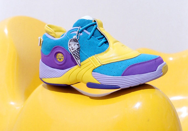 Answer V鞋款以BBC ICECREAM的代表配色:藍、紫、黃三色作為主調,無論鞋面或鞋底均注入多種搶眼色彩,鞋側綴有雪糕骷髏標誌;除了原有藍色鞋帶外,隨鞋盒附上白色鞋帶,讓鞋迷隨意襯搭多款獨特造型。
